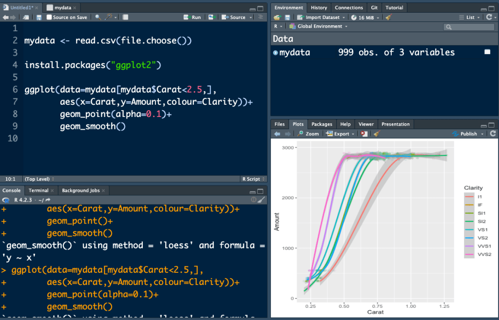 aes(x=Carat,y=Amount,colour=Clarity))+