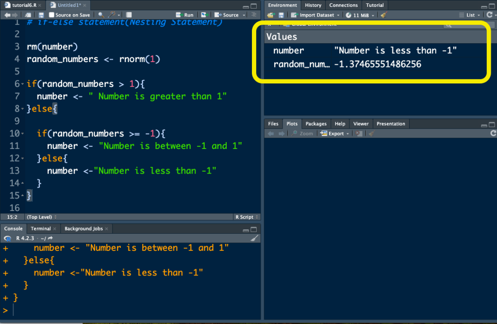 random_numbersis less than -1:number <- "Number is less than 1": The variablenumberis assigned the string value “Number is less than 1”.