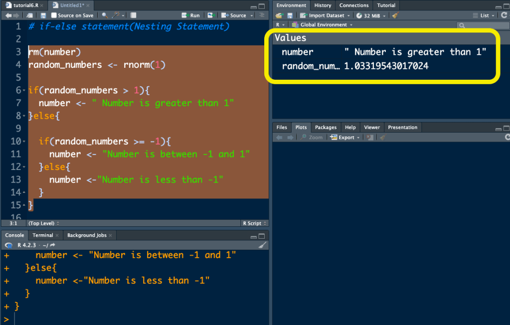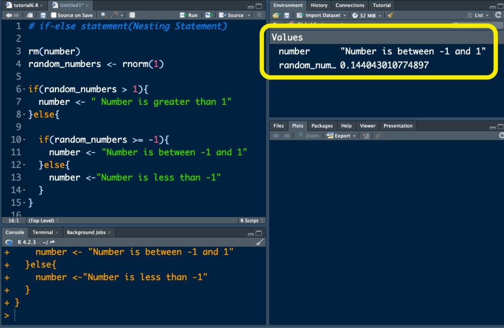 random_numbersis greater than or equal to -1:number <- "Number is between -1 and 1": The variablenumberis assigned the string value “Number is between -1 and 1”.