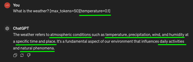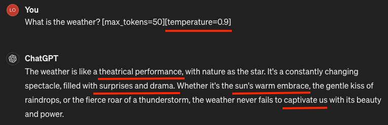 In this example, we’ve adjusted the temperature, max tokens, and top p parameters all in one prompt.