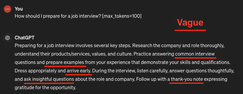 Just like setting a word limit for a school essay, we can tell ChatGPT how long we want the response to be. It helps keep things short and sweet, so we don’t get overwhelmed with a long answer.