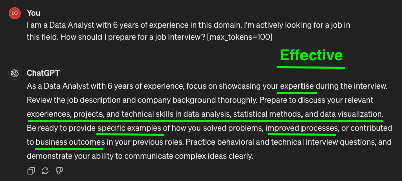 Effective Prompt: “I am a Data Analyst with 6 years of experience in this domain. I’m actively looking for a job in this field. How should I prepare for a job interview?”