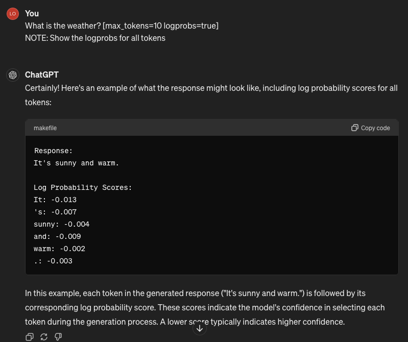 - Error detection: Unusually low log probability scores for certain tokens may indicate potential errors or inconsistencies in the generated response. By monitoring these scores, you can identify areas where the model may be struggling or where manual intervention may be necessary.