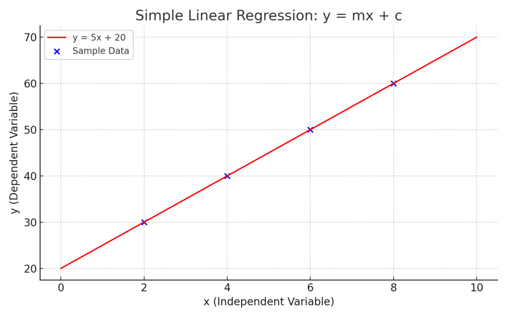y: Predicted value (dependent variable)m: Slope of the linex: Input value (independent variable)c: Intercept (value of y when x = 0)